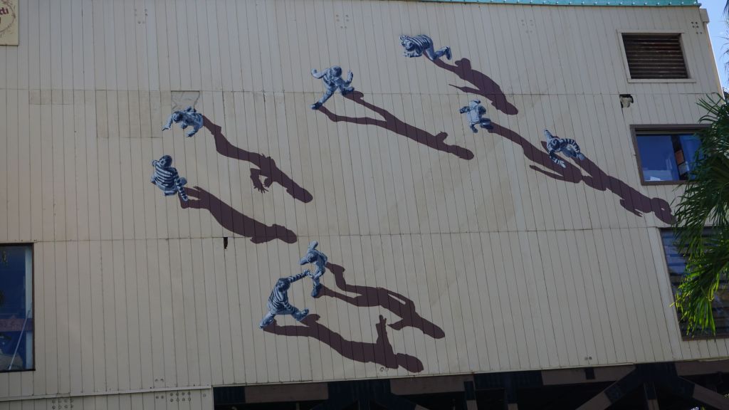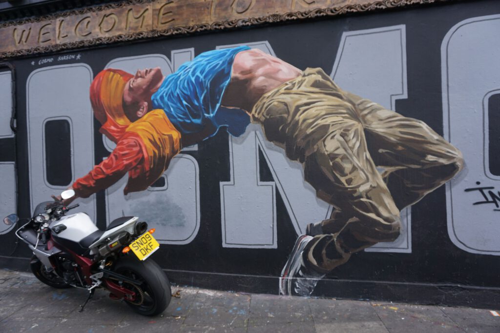 So my hunt continues. More images to capture on railway embankments and deserted streets. Themes to follow up on the tops of buildings. Photorealistic images to find situated in unlikely locations, the drive to identify the murals hidden behind “No Trespassing” signs, all the while balancing that fear of falling with a liberating sensation of flying.