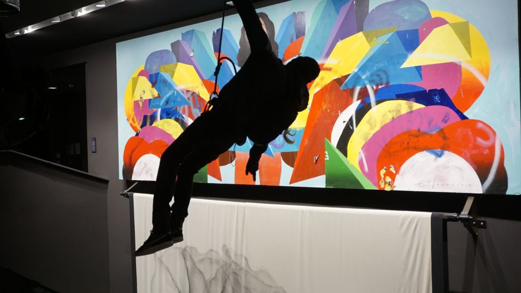 Another “suspension” installation appeared in the first museum devoted to street art Urban Nation Museum for Urban Contemporary Art, in Berlin. This photograph was taken from within the museum on the second floor where the central figure, a suspended street artist at work is strategically placed between the artwork of two other artists. This installation hints at the physical conditioning, self-assuredness and devotion to this craft that is required of these individuals, it also highlights the obvious dangers that surround their work.