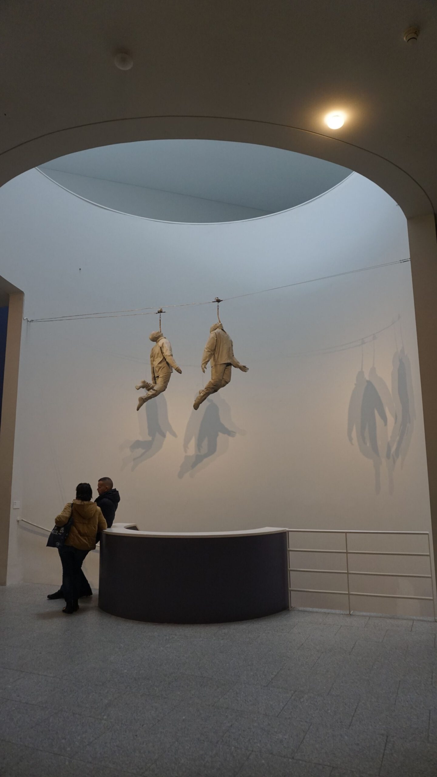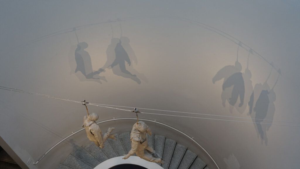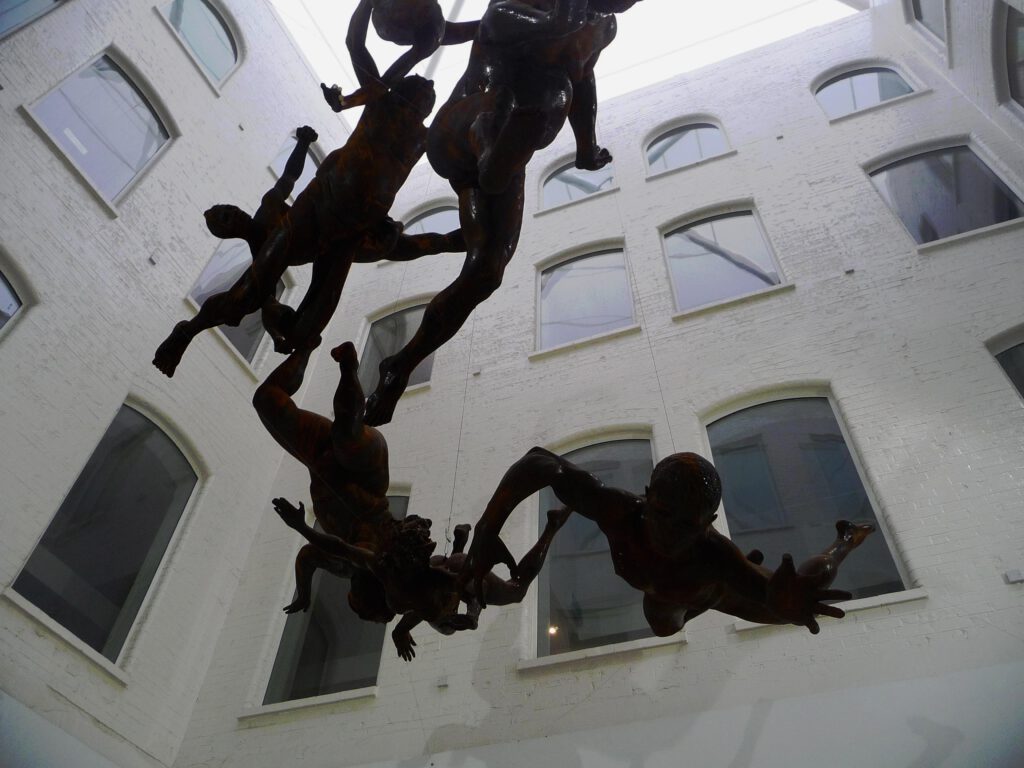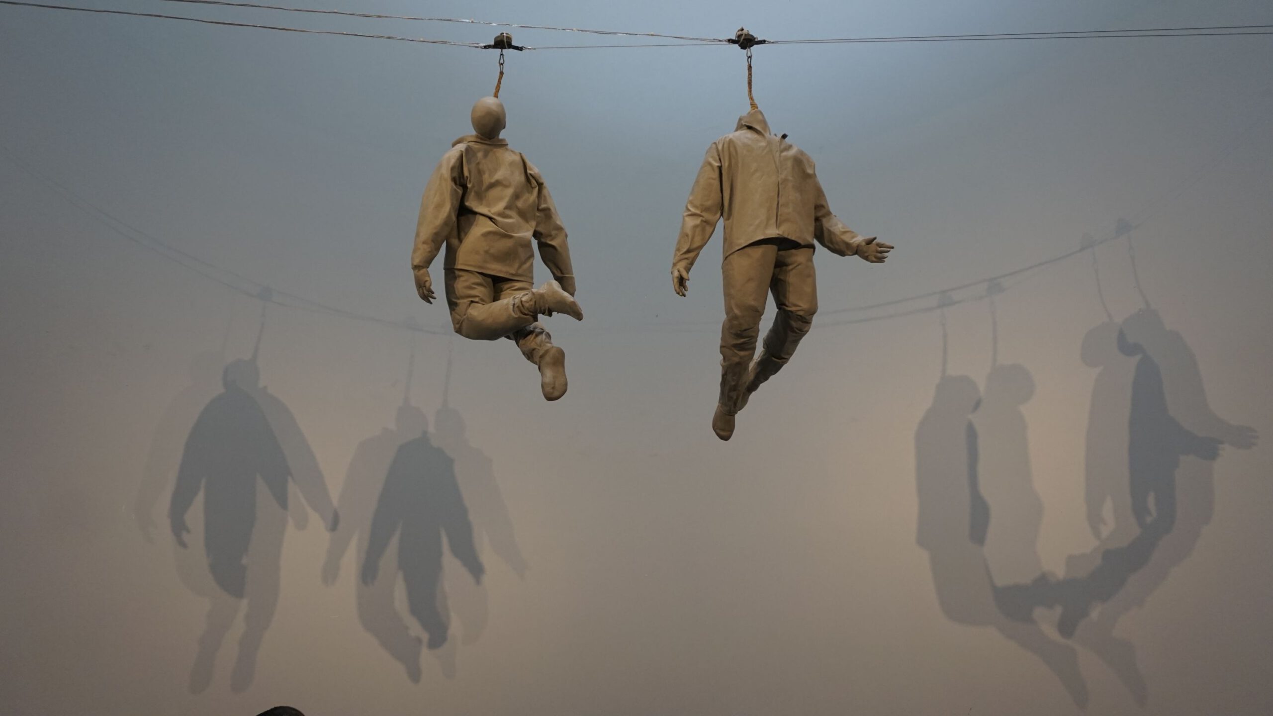 Suspension themes continue to be the focus of the haunting installation at the 2019 exhibition in Lisbon’s Museu Coleção Berardo. The horror of this image is magnified by the complete indifference of the museum attendees standing directly below these victims. These images are at the apex of suspension anxiety, they are at the “I am not kidding” stage. It is the last step of the final fall.