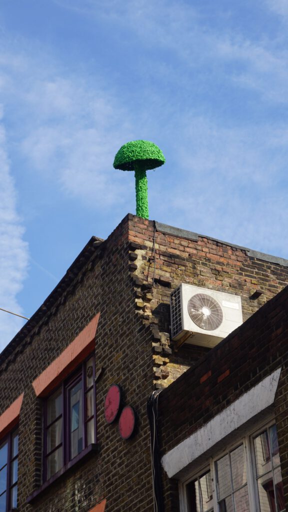 Esoteric examples of being on the edge could include the two subway cars sitting on the rooftop of the Village Underground building in London. Or how about the balance-defying design of the Santa Justa Lift in Lisbon, a giant green mushroom taking root or a pink mannequin in London considering the inevitable. All are completely illogical.