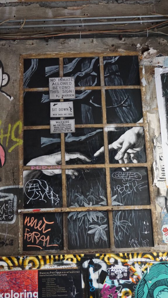 The work of renowned urban artists such as, Faith47, Guerrilla Girls, Ms Van, Blu, mrcenzone, Pang, HeraKut, Ben Eine, Borondo, Mr. Brainwash and Swoon are often seen in these areas, and they have morphed into the sought after stars that headline the international bus and walking tours of the world. These “behind bars” pieces can also be considered symbolic of the ongoing threat of the legal prosecution of such luminaries as Shepard Fairey, Girafa, and Invader.