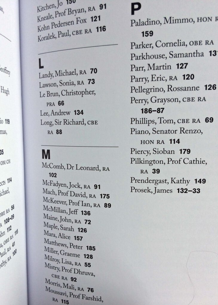 So with this news flooding the headlines, I found the fresh new copy of the RA’s artist index on the coffee table, so I readied my well-practiced growl and sharpened a claw.