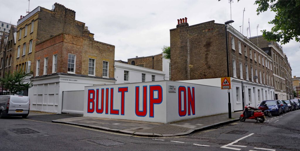 I was so completely beside myself after learning of the appearance of Mickey, Homer, and Batman, my childhood kin, that a pilgrimage to the Lisson Gallery for the family reunion immediately took shape. Located near the Paddington Tube Station, the gallery is a pioneer not only in its long history of developing contemporary art but also for its lonely choice of location. It can be a bit confusing to find, but if you don’t do anything other than turn right out of the tube station, walk under a bridge with some lovely street art, and turn right on Bell Street, you will come upon a large “Built Up On” installation. The galleries are on both sides of the street.
