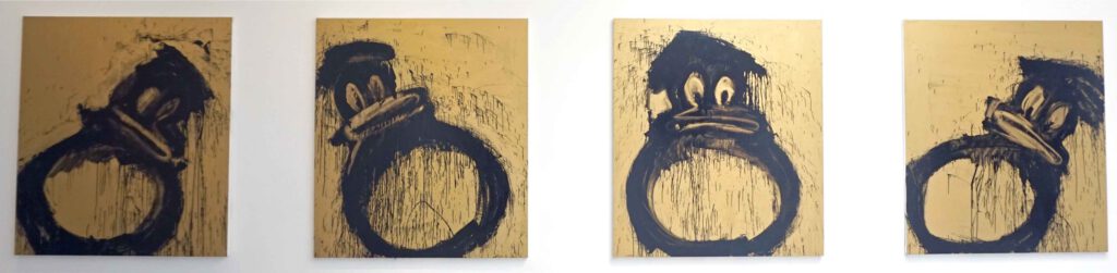 The golden hour to visit any high end art gallery is a Tuesday morning, nano seconds after the “We’re Open” sign appears. Nothing compares with the pleasure of touring a well hung show in a huge un-peopled space, just after the staffs’coffees have cooled and other art enthusiasts are either still in bed, or at work drumming up enough dosh to pay for walls big enough to support Homer’s head or a rollicking gang of golden Donald Ducks.