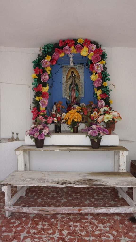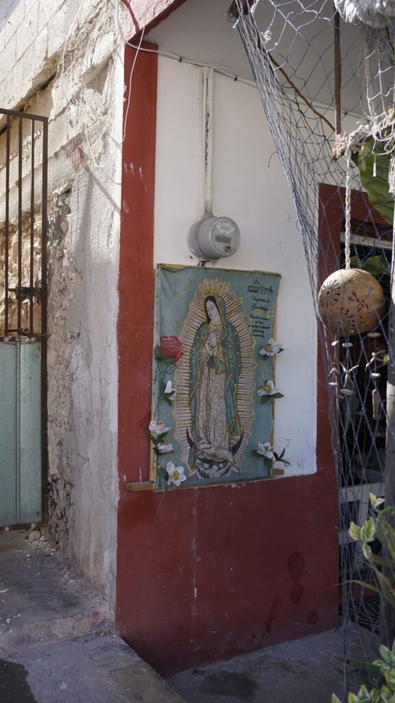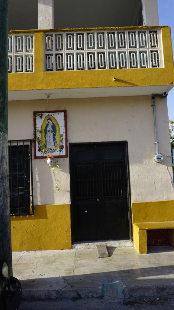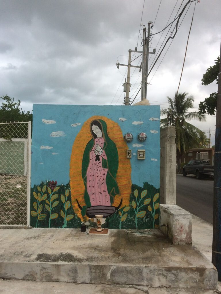 Learning things. It happens. Either by intent, by accident, or by bicycling around the Mexican town of (only-one-s) Progreso in the Yucatán. It’s a place that honours family, the citizens are quick to smile, and really cute children squeal at the pitch of peacocks. It has a modern culture that has slept in the shadows of the ancient pyramids built by its ancestors – and centuries later, live with the omnipresent 500 year old image of the Virgin of Guadalupe mounted on their doors.