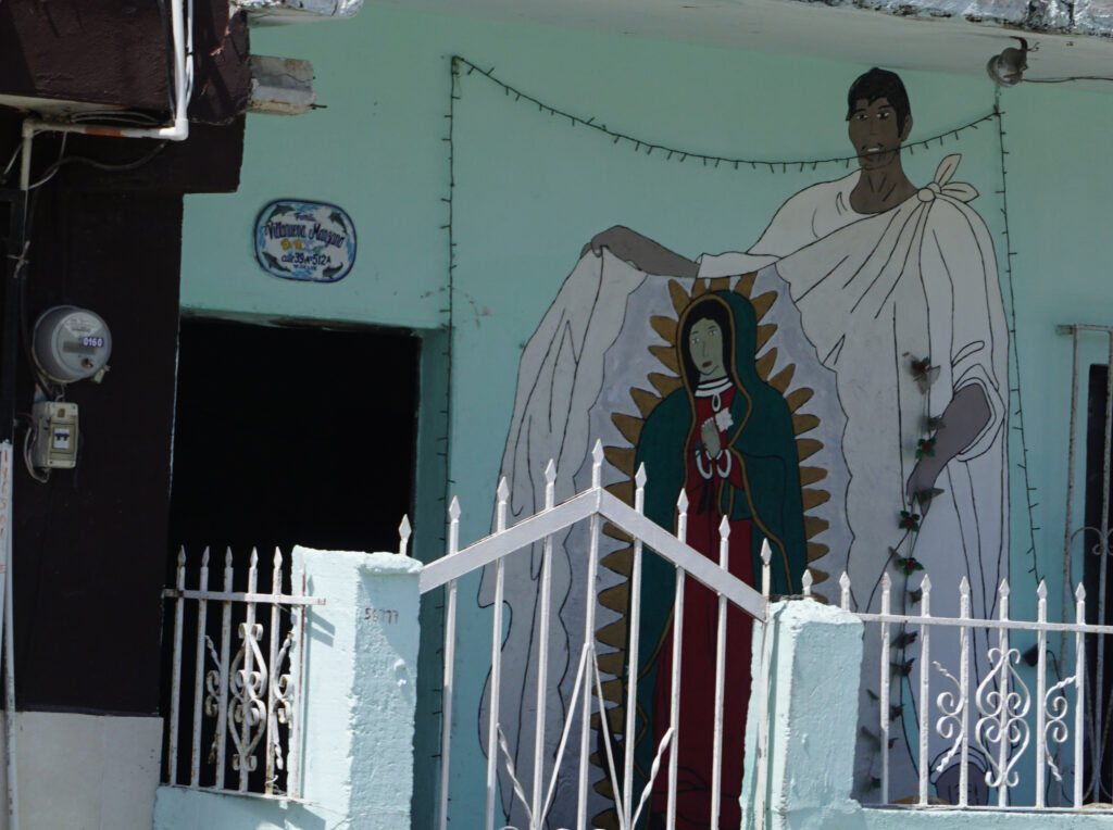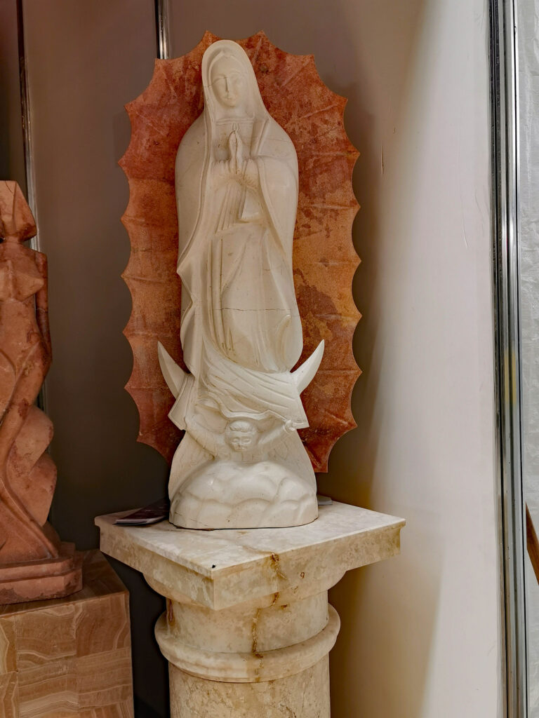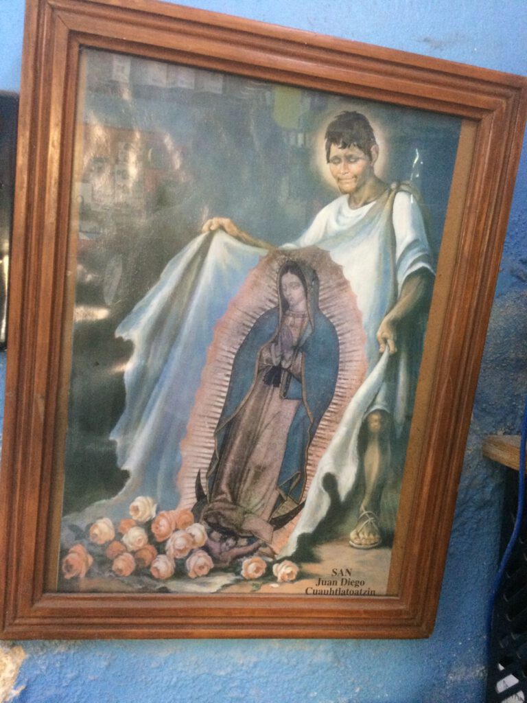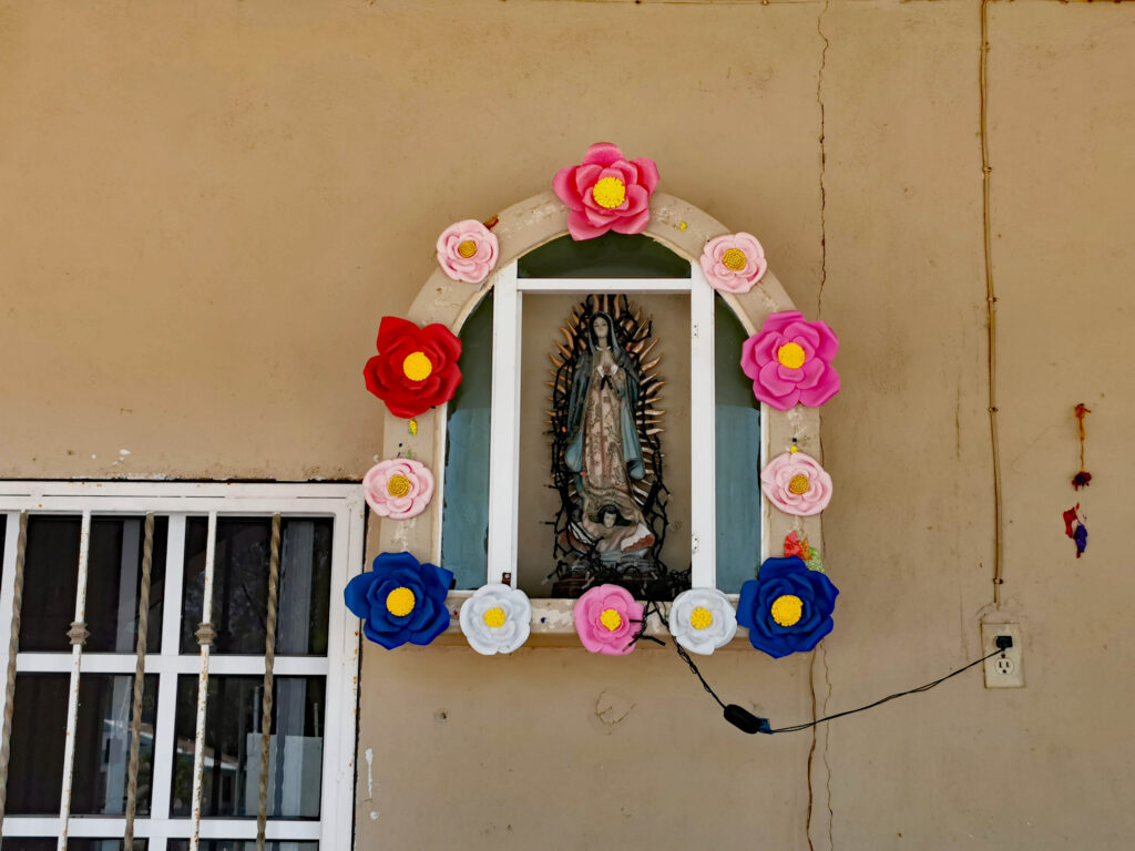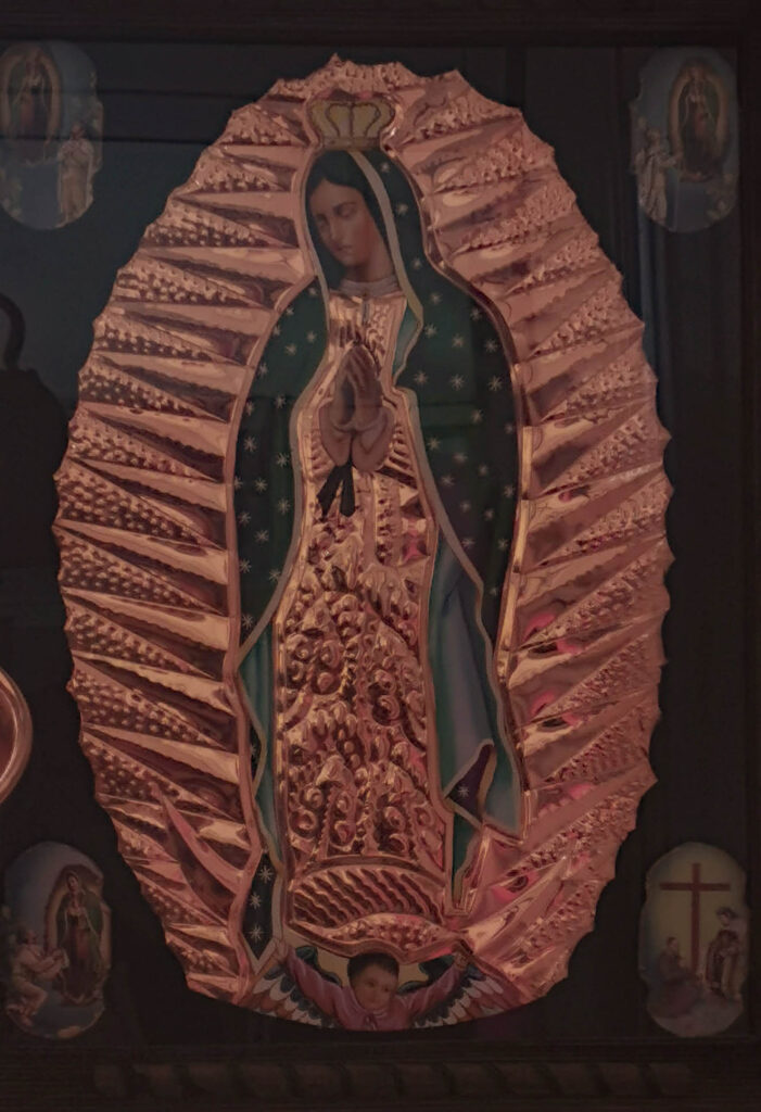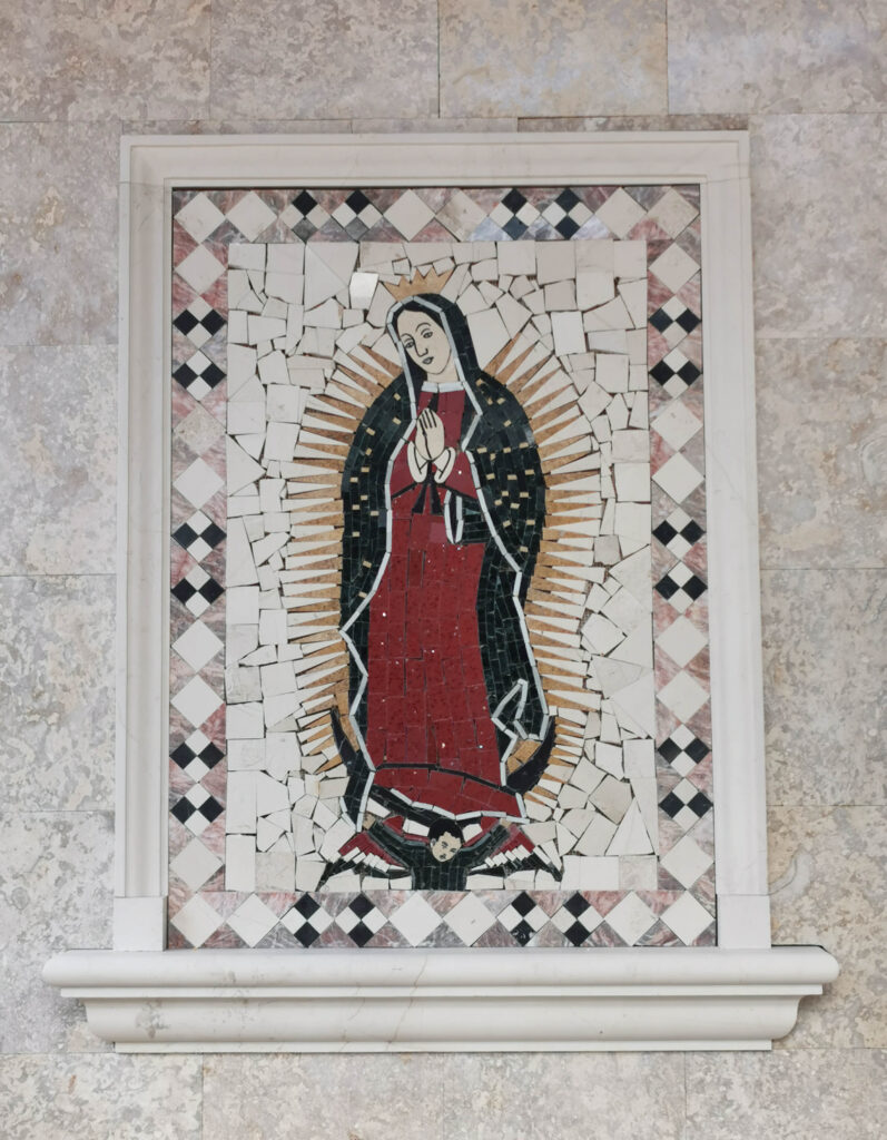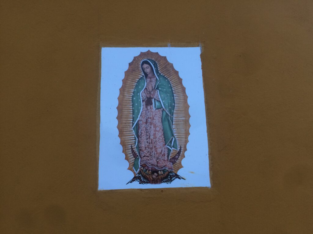 To “read” these installations it is worth being familiar with the symbols associated with The Virgin of Guadalupe. They include: – The Virgin standing in the middle of the sun, this implies that she is more powerful than the native’s most powerful sun god,’Huitzilopochtl’; – she stands upon the moon, a symbol of the local god of night, insinuating that she is more powerful than their god of darkness; – since the indigenous gods stare with eyes wide open and straight ahead, the Virgin’s averted gaze insinuates that she is not a god; – she is being carried by an angel which is a symbol of royalty; – she is wearing a blue mantle with a gold border which also implies royalty; – her red dress is a sign of martyrdom for the faith and also of divine love; – the gold brooch around her neck is a symbol of sanctity; and – although the Virgin is obviously pregnant, the four-petaled flower, or flower of the sun, around her waist symbolizes her virginity.