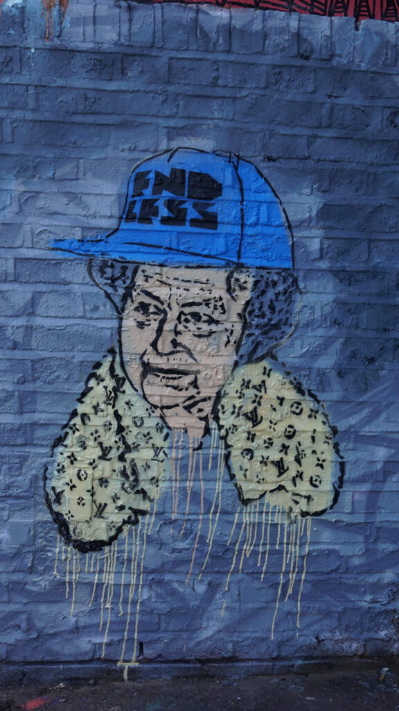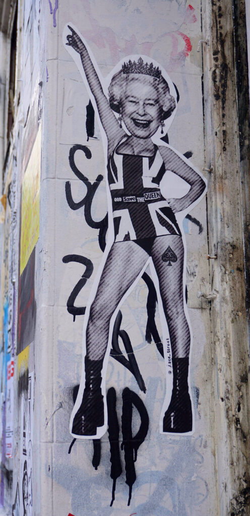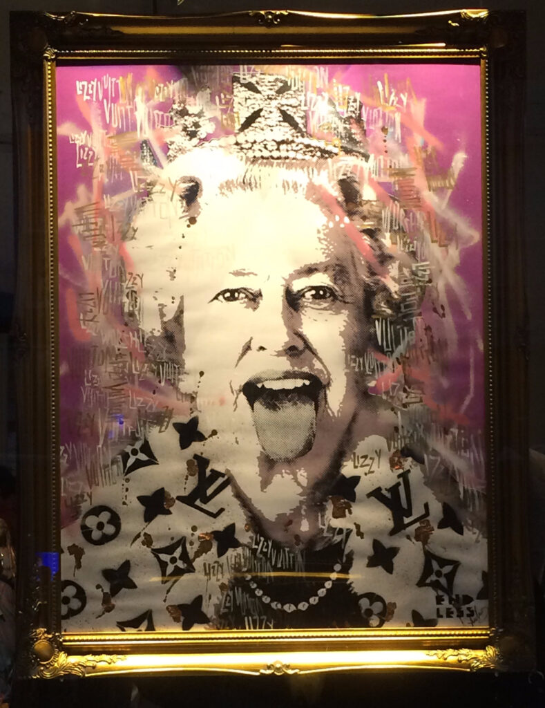 One of Queen Elizabeth II’s first statements following her coronation was that she wanted “… to be worthy of your trust…”. It was such a disarming and humble sentiment that it seemed to set the stage for a long career laced with an enviable amount of public respect and a lifetime be-kind-pass by many street artists. When we move away from Liz’s heavily controlled public image and look at her street treatment, she appears to occupy a privileged position in the art appreciation spectrum – somewhere between – taking-the-piss and – a quasi-sentimental respect.