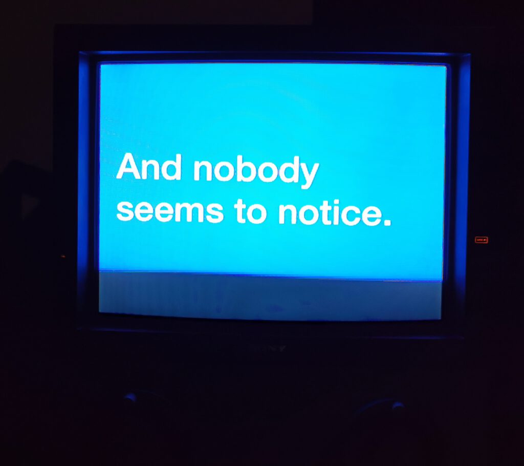 Cokes marries the dialogues with flashing lights and bold colours that assail your eyes on monitors. We read texts that are at odds with what we are actually hearing. It becomes a question of perceived reality. Which is more true? Which aspect will the brain believe? Which format will be more convincing?