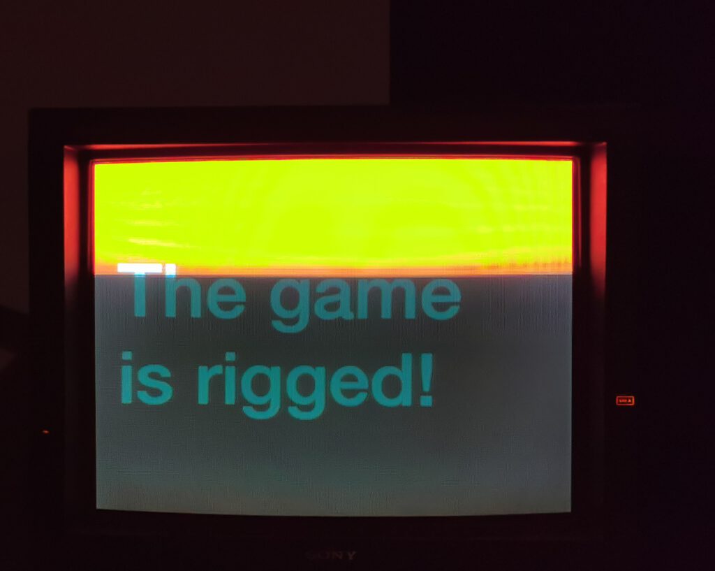 Every aspect is intentionally over-amped. The combination of flashing primary colours, loud music and issue-laden dialogue is packaged in a bold and sensible san-serif text and delivered on the several monitors distributed throughout the three floors of the gallery. Be prepared, for Cokes’ worldview is . . . now . . . and disturbing.